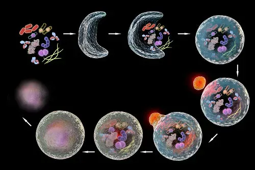 - آنها را در کیسههای کوچکی به نام اتو فاکول/اتوفاگوزوم بستهبندی میکند.