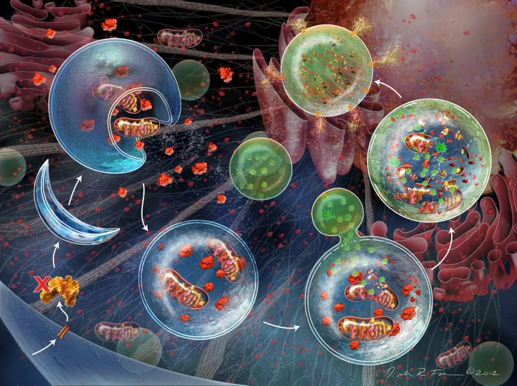 - بخشهای خراب، فرسوده یا سمی خود (مثل میتوکندریهای آسیبدیده، پروتئینهای تجمعیافته و…) را جمعآوری میکند.